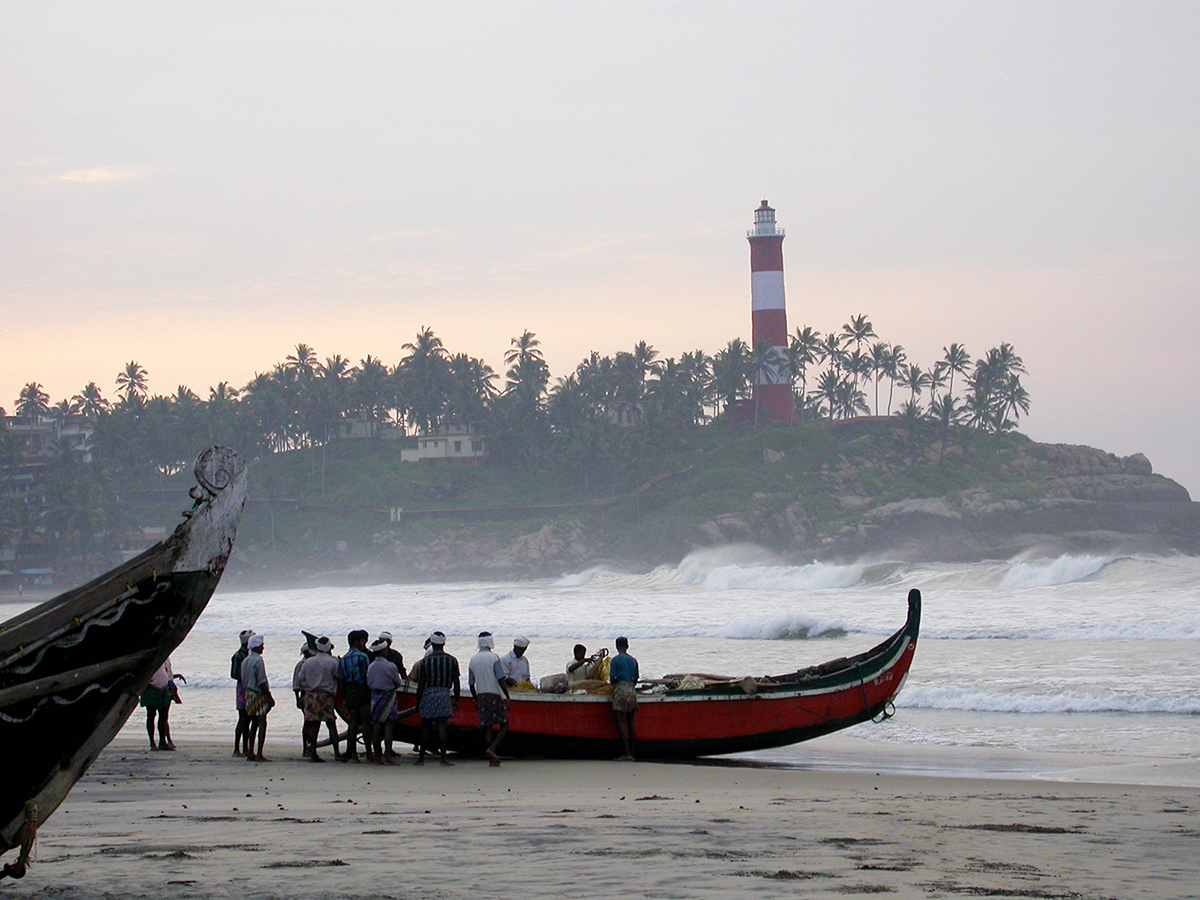 Once a small fishing village Kovalam കോവളം, has dramatically developed into a popular and busy tourist resort over the last thirty years. Presently, Kovalam has many faces. Early in the morning the fisherman share the beach with meditating yogis, dogs, and birds. As the sun rises from behind the coconut palms, Kovalam wakes up: local children play soccer and cricket, and both Indian and western tourists start strolling on the beach. During the day, tourists take over the beach. When tired of sunbathing, swimming, and surfing, they explore the hand crafts, jewellery and clothes shops that are spread along the waterfront and in the narrow streets. The restaurants serve fresh sea-food and a variety of continental meals till late in the evening.